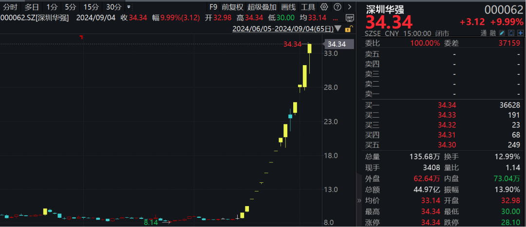 9月4日,深圳华强尾盘再度涨停,自8月15日以来,股价已录得15天14板,累计涨幅294%,最新市值359亿元,成为近期A股最闪亮的“明星”。