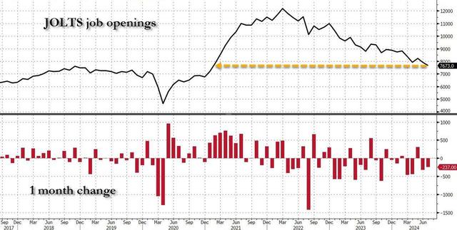 周三公布数据显示,美国7月JOLTS职位空缺767.3万人,降至2021年初以来的最低水平,大幅不及预期的810万人,前值从818.4万人下修至791万人。